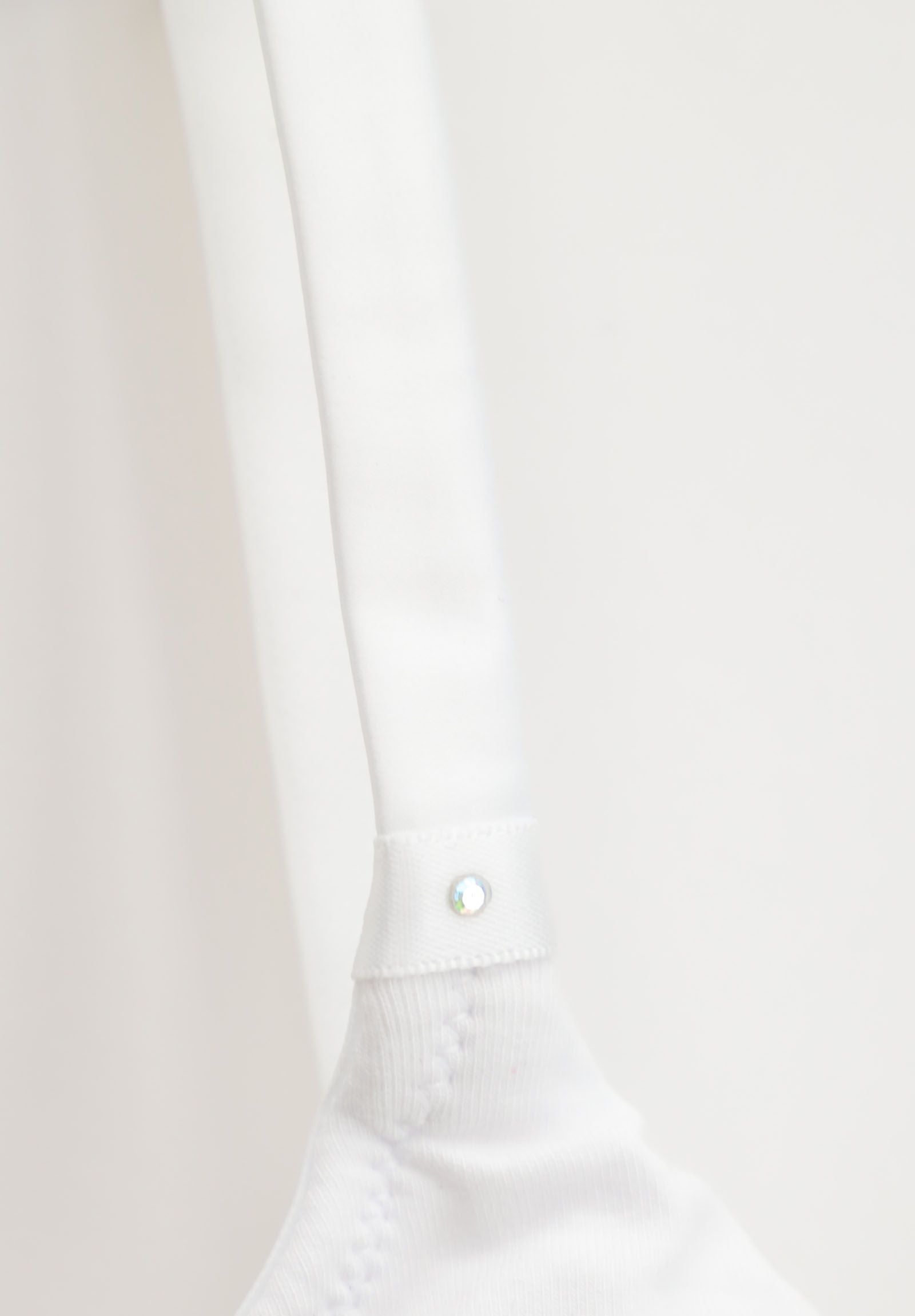 Body incrociato senza ferretto in tessuto di cotone che offre un effetto fresco e naturale sulla pelle. Coppe preformate in cotone doppiato, garanzia di comfort e sostegno. Grazie all’incrocio, le coppe contornano il seno sostenendolo come un ferretto. Allo stesso tempo, l’incrocio separa il seno in modo naturale. Raffinate spalline in raso e graziose applicazioni in strass.