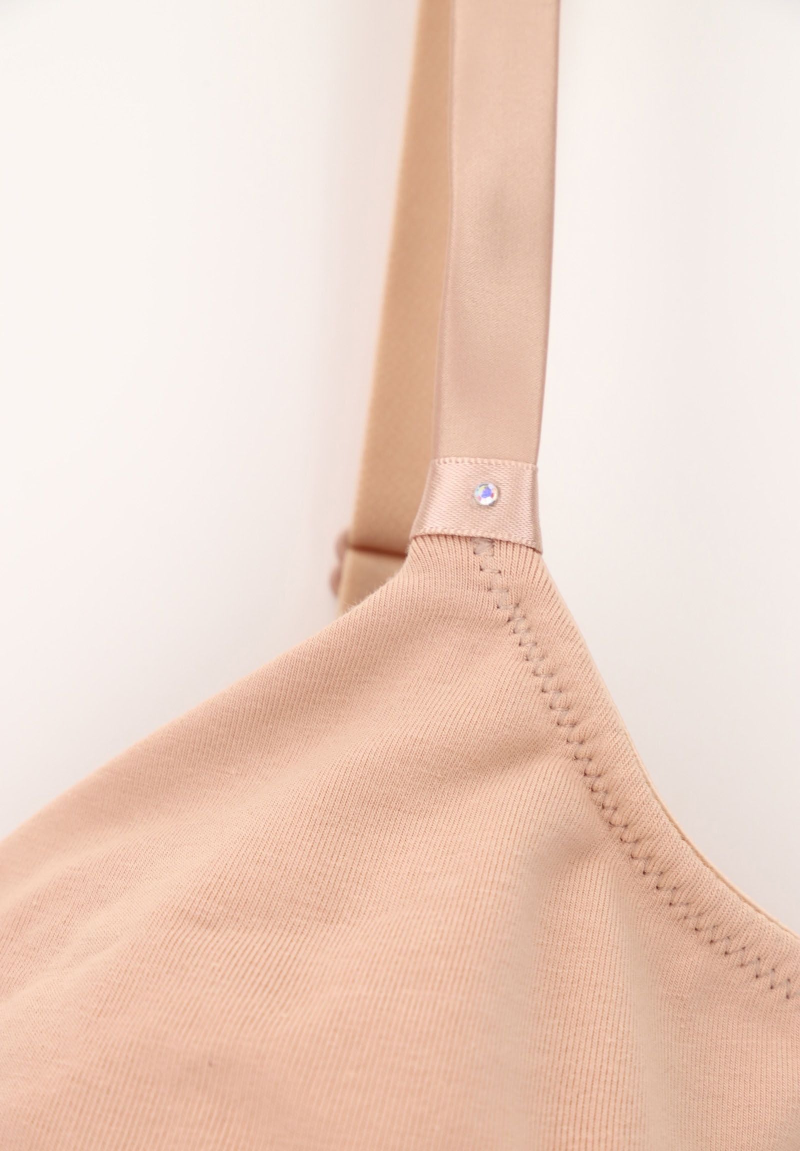 Reggiseno senza ferretto in tessuto di cotone per un naturale effetto di freschezza sulla pelle.Le coppe in cotone, doppiate e preformate, offrono un ottimo sostegno ed un piacevole comfort. Grazie alla sua linearità e all'assenza di cuciture, è un capo che risulta invisibile sotto gli abiti.Le raffinate spalline in raso e le applicazioni in strass completano l'opera.