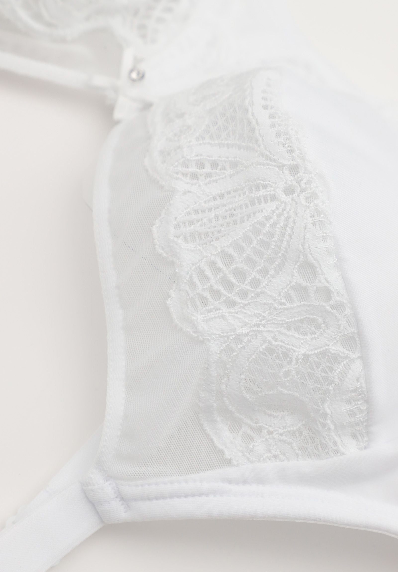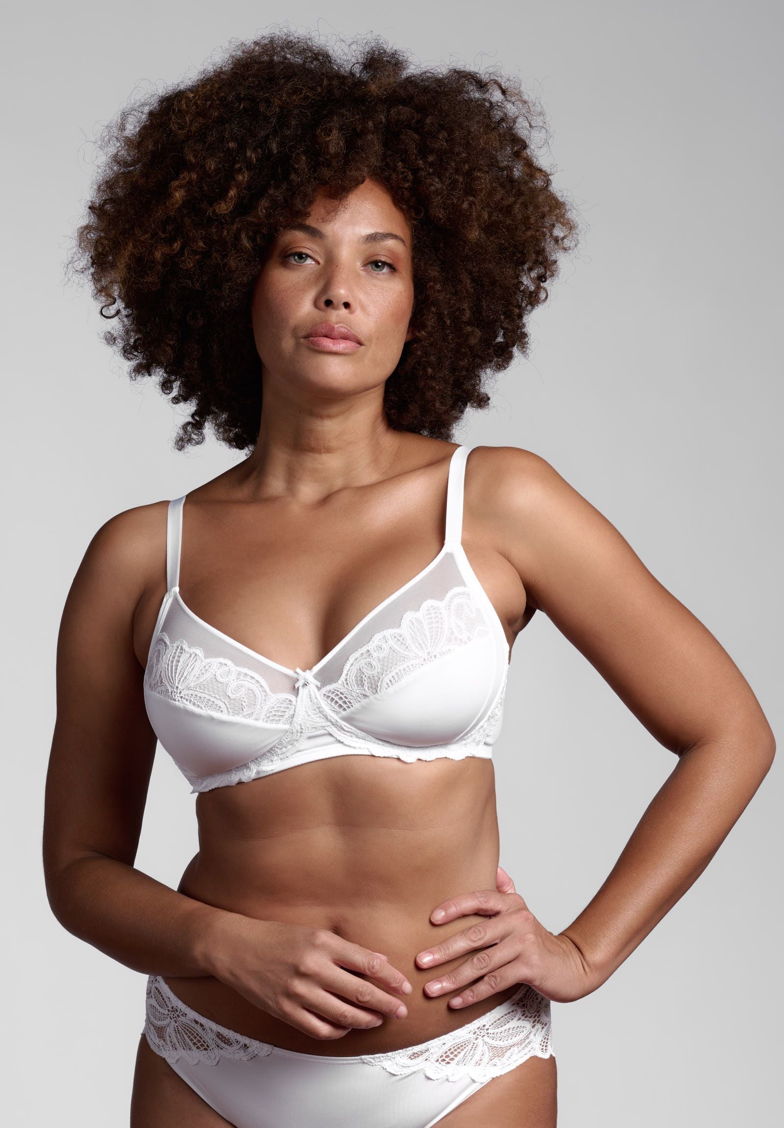 Reggiseno senza ferretto realizzato in morbida microfibra con le coppe foderate in cotone. Nella parte superiore della coppa risalta un raffinato pizzo cordonetto, doppiato da un leggero e morbido tulle.Un piccolo fiocchetto con strass illumina il centro del reggiseno e rende ancora più elegante il capo.Il modello Belseno ha le ali che abbracciano, modellano e sostengono il seno per il comfort più assoluto.